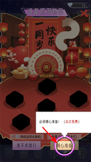 3、点击精心准备按钮,可提升抓周物品的品质,这是优化抓周效果的关键步骤,准备时需关注物品品质对家族成员的影响。