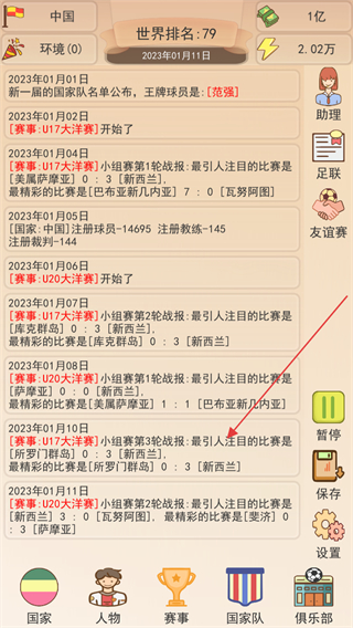 3、进入游戏主页,展示了不同日期的赛事动态如U17、U20大洋赛、国家注册信息等内容,可通过该界面追踪各类赛事战报与游戏进程。
