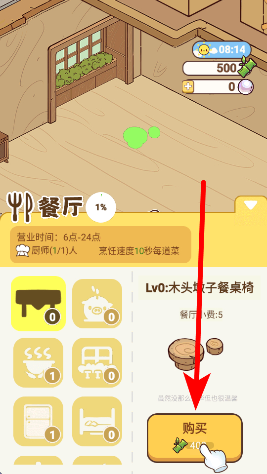 3、餐厅布置不能少,可用获取的资源购买桌椅等设施,比如木头墩子餐桌椅,布置后能提升餐厅氛围,还可增加餐厅小费。