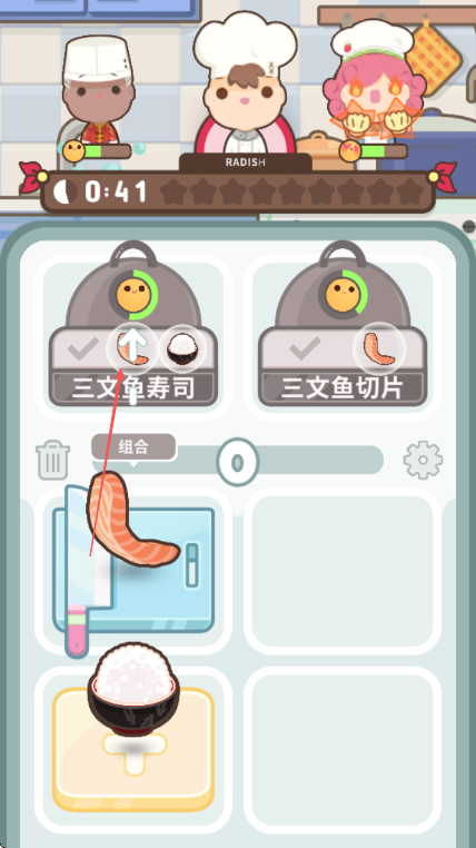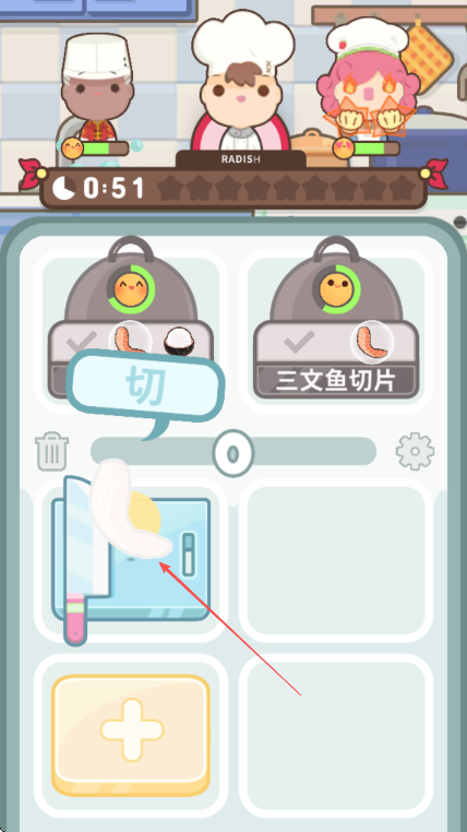 2、将三文鱼放到砧板处,根据提示点击刀具进行切割。
