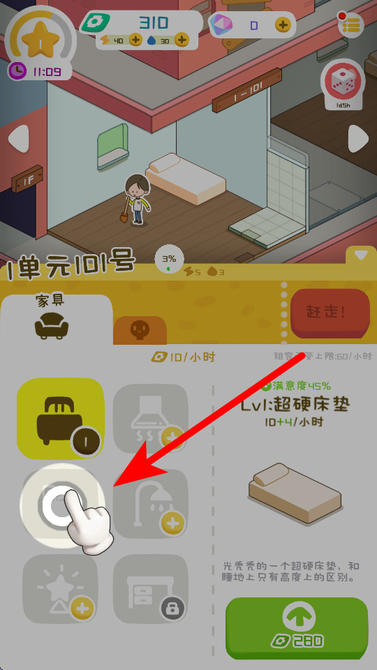 3、在家具栏中,点击对应的家具图标,可对房屋内的家具进行添加或升级操作,比如能升级出超硬床垫等家具。
