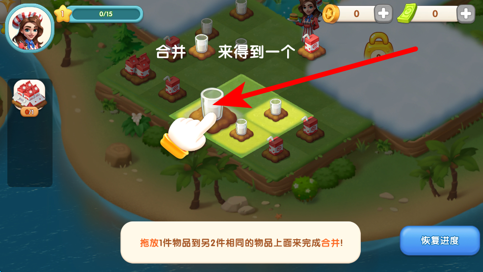 2、在场景中找到相同的物品,按照提示,拖放其中1件物品合并到另外2件相同的物品上面,完成合并操作,从而得到新的物品。