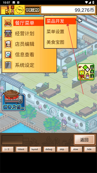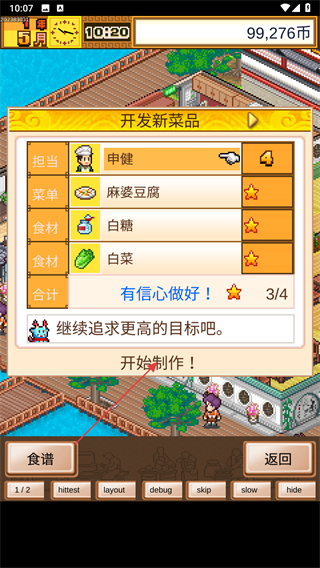 2、在餐厅菜单列表点击菜品开发,选择一款味道评分不佳的菜品进行开发。