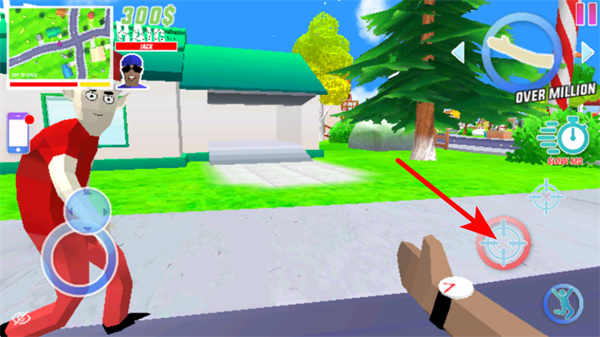 4、在室外场景中,点击红色箭头指向的瞄准按钮,可对目标发起攻击,推进游戏流程。