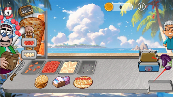 6、点击厨师身上的盒子,打开洋葱、番茄等调料,放入盘中备用;