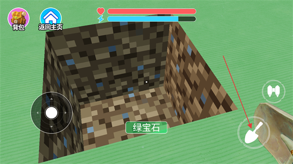 2、进入游戏关卡后,点击界面右侧的铲子按钮,挖掘地块可收集出现的绿宝石这类矿石资源积累财富。