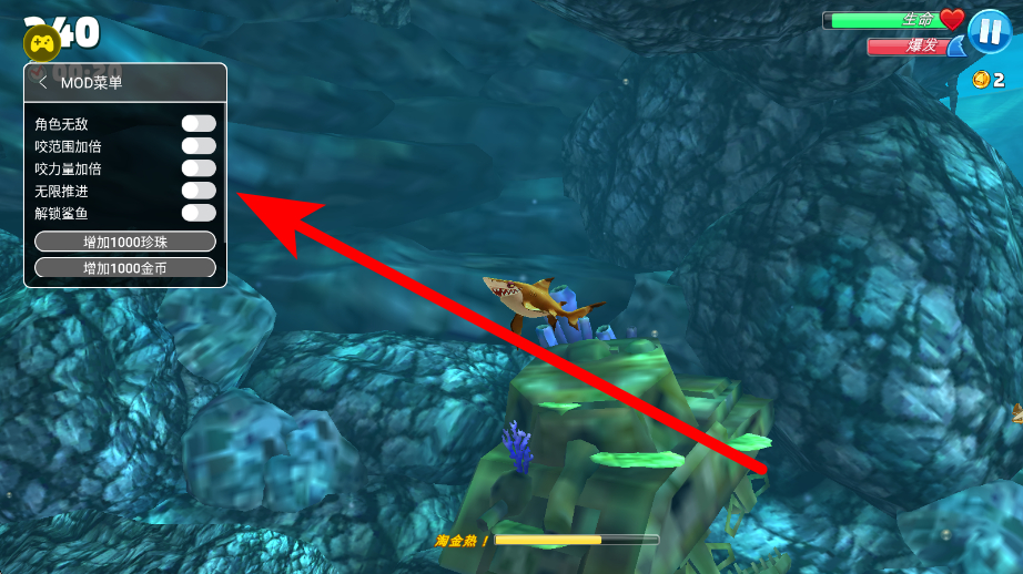 4、使用菜单作弊时,打开菜单界面,可利用角色无敌、咬范围加倍等作弊功能,助力鲨鱼在海洋中生存与成长,提升游玩的体验。