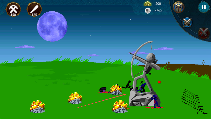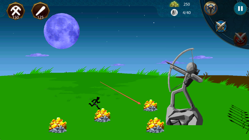 2、看到灰色弓箭手火柴人雕像以及蓝色敌人时,指挥黑色火柴人靠近金矿开采,同时躲避敌人攻击。