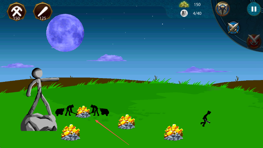 3、若金矿数量减少,如变为150,继续引导黑色火柴人前往金矿堆开采补充资源。