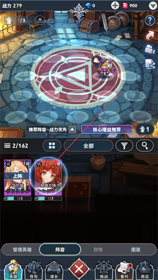 1、进入游戏后,点击下方的英雄选项进入英雄卡牌背包,点击还未上阵的英雄进行上阵操作。