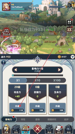 4、在游戏主页下方的成长选项中,可以提高队伍的影响力属性,消耗金币进行升级。