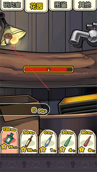 2、可以通过点击下方的各类道具如不同NP消耗的工具来加速蘑菇的生长或获取更多NP。