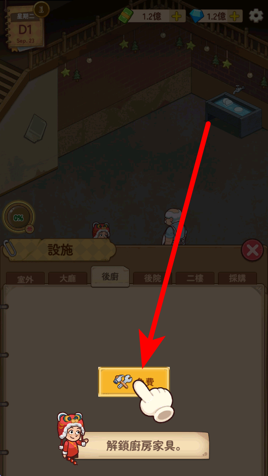 3、进入设施界面后,若要解锁厨房家具等设施,找到标有“免费”的按钮并点击,即可解锁相应的厨房家具,丰富店铺的设施配备。