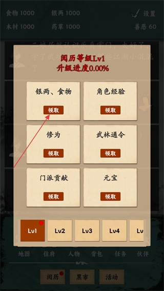 4、进入阅历等级Lv1界面后,可看到银两、食物等资源选项,点击对应选项下的领取按钮,获取相应的游戏资源。