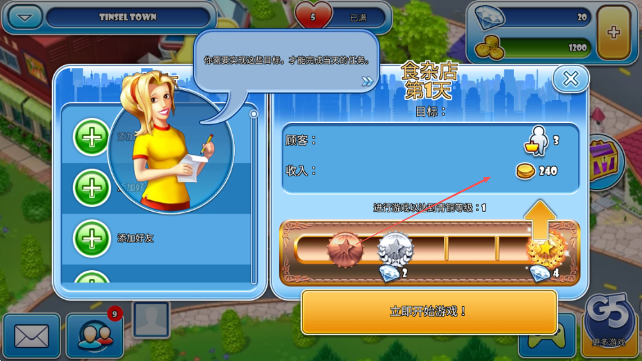 1、在食杂店第1天界面,查看目标,明确需接待3位顾客、获得240收入,点击立即开始游戏。
