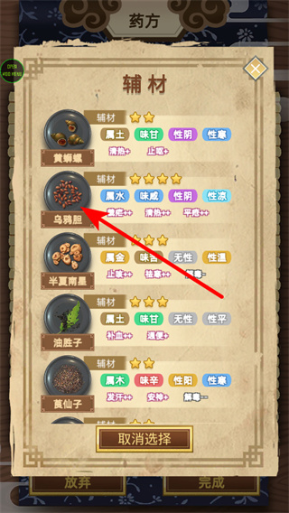 4、选择乌鸦胆等辅材进行药方配置,辅材选择是配药的重要操作,选择后可根据药材属性搭配药方,制作出疗效显著的药剂。