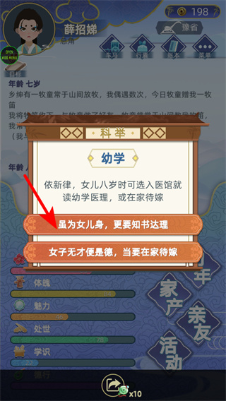 1、面对幼学选择时点击虽为女儿身,更要知书达理,选择操作是规划发展的关键操作,选择后可进入医馆学习医理。