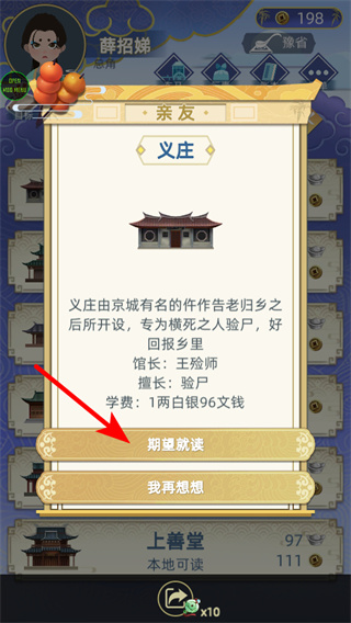 2、在就读选择时点击期望就读,就读选择是提升能力的核心步骤,选择后可进入义庄学习验尸技能,为后续职业发展奠定基础。