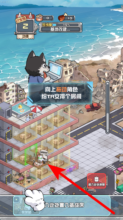 3、安排房间,收留幸存者后,手指向上拖动角色,为其安排合适的房间收留,让幸存者有居住之所,保障基地内人员的生活秩序。