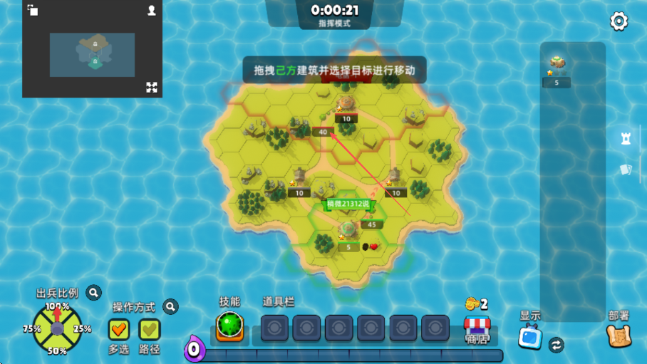 1、进入游戏指挥模式,依据拖拽己方建筑并选择目标进行移动提示,拖动建筑选择目标移动。
