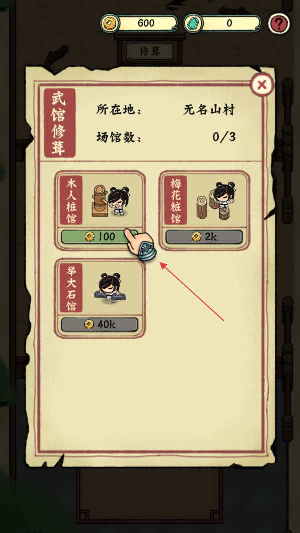 3、在“武馆修葺”页面里,选择需要花费100金币的木人桩馆,点击对应的修建按钮,完成木人桩馆的搭建,此时武馆成功拥有第一个场馆。