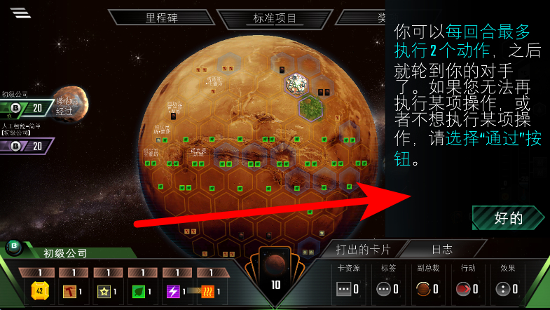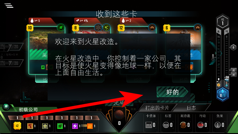 2、然后了解目标,通过提示知晓在游戏中,要控制公司使火星变得像地球一样,以便能在上面自由生活,明确改造的最终方向。