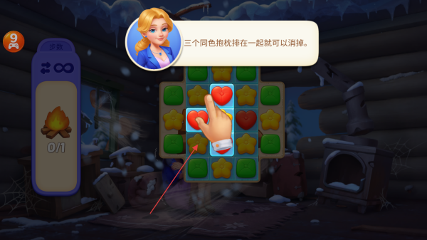 1、游戏开局先掌握基础规则,三个同色抱枕排在一起就可以消掉,跟着指引尝试消除,熟悉操作。
