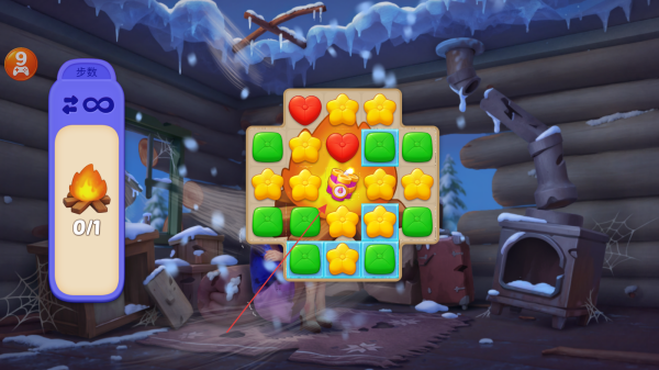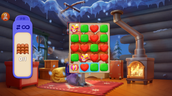 3、留意左侧任务,比如要完成壁炉相关目标,需通过消除红绿等抱枕来推进,关注任务进度【0/1】。