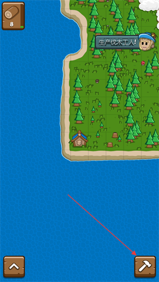 1、进入游戏后玩家将会诞生在一片森林边角,需要砍伐树木进行建造家园,点击下方锤头按钮进行建造。