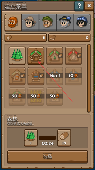 2、选择伐木小屋在岛屿上进行建造,每秒自动收集周边区域的木头。