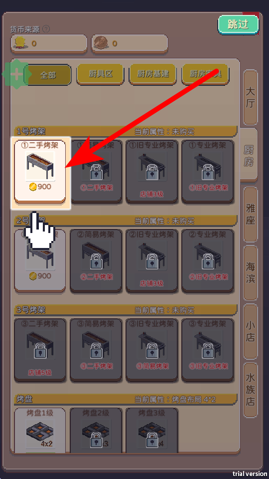 3、不同烤架有不同解锁条件,有的需店铺达到指定等级,有的需满足特定经营要求,解锁更高级烤架,能制作更丰富、品质更好的烤制菜品,吸引更多顾客。