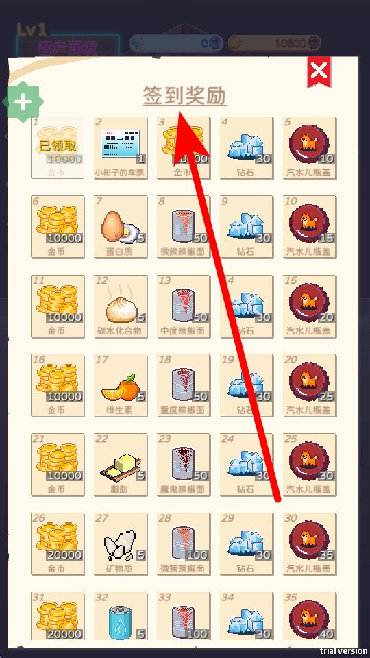 4、每日签到能获取奖励,在签到奖励界面,可看到不同天数对应的奖励,有金币、钻石、各类食材等,按时签到能积累资源,助力店铺经营。
