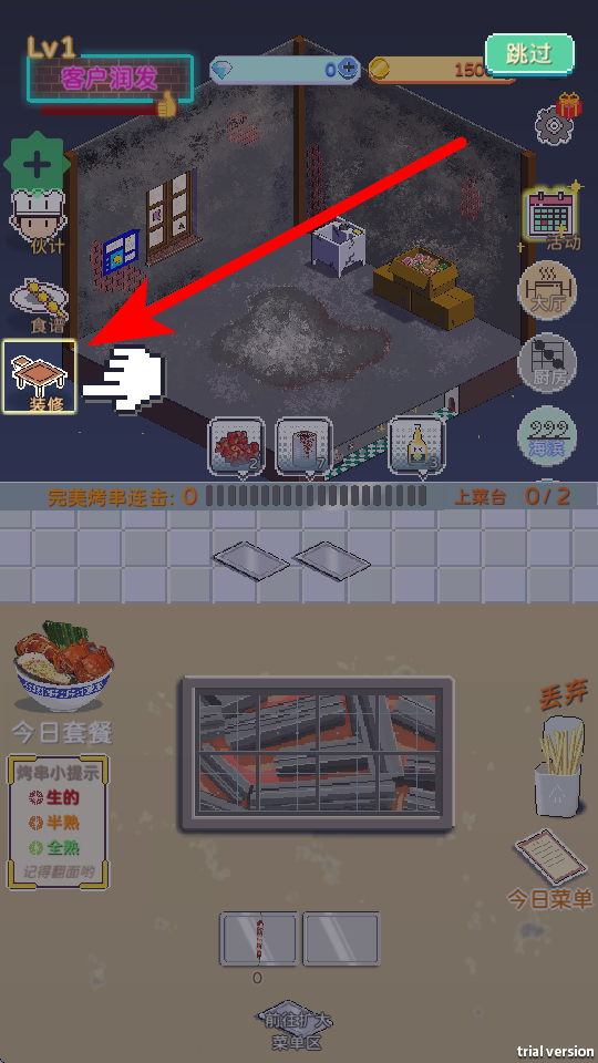 3、店铺装潢定制:提供数百种装饰道具与布局方案,从桌椅摆放灯笼悬挂到墙壁粉刷,玩家可以按照喜好打造独一无二的烧烤小店风格。