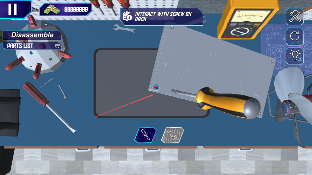 4、根据提示与后壳等部件互动,检查内部电路板等组件,维修或更换损坏零件,完成修理任务。