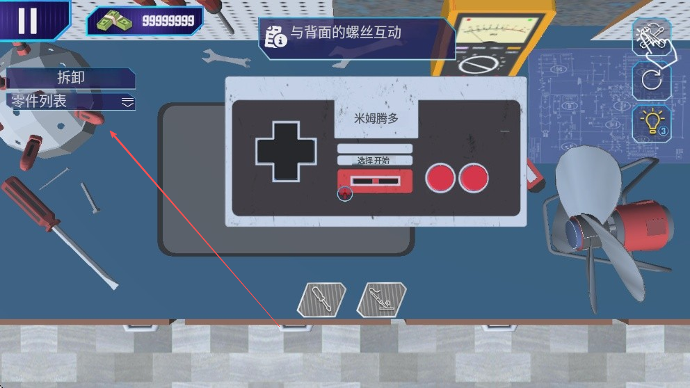 1、进入游戏,在工作台找到待修理的游戏手柄,点击进行修理操作。