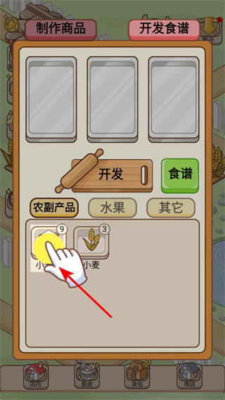 3、进入制作商品界面后选择如小麦之类的农副产品,可开发食谱制作食品,这是开展经营关键操作,根据原料库存需求搭配。