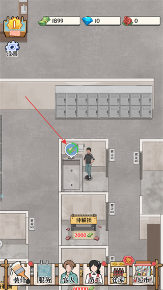 1、当前界面中点击男浴室,了解该设施中顾客需求,可通过底部市场按钮筹备所需资源以进行服务。