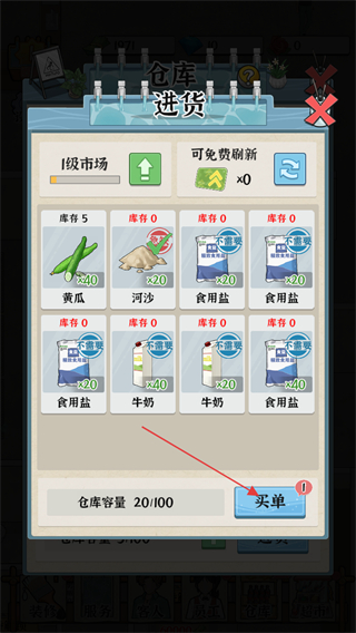 3、在仓库进货界面找到河沙,选中该物品后点击底部买单,完成采购以补充沙浴所需物资。