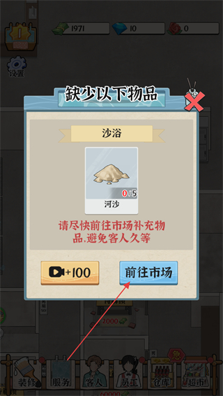 2、界面弹出缺少以下物品提示,显示沙浴需河沙,点击前往市场按钮补充物品,避免客人等待过久。