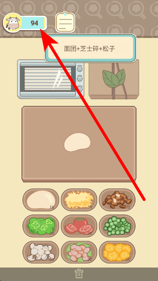 1、菜品制作时,可查看配方提示,选取面团、芝士碎、松子等食材,将食材合理组合后,用烤箱等厨具制作,制作出的美食可用于售卖,获取经营收益。