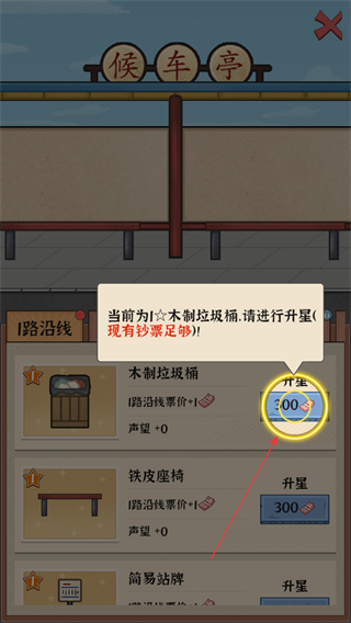 4、在路线对应的候车亭区域,消耗货币升级建筑,完成升级后可提升对应路线的公交票价,助力后续收益增长。
