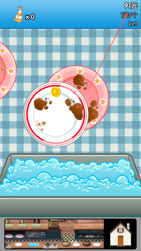 3、清洗过程中留意盘子上出现的金币,收集金币增加收入。