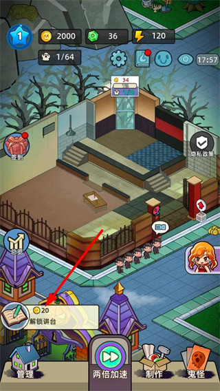 2、找到讲台选项,消耗金币解锁,完成解锁后讲台会布置到场馆中,提升场馆的惊吓值与基础收入。
