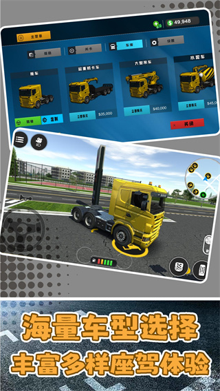 4、玩家将操控多种类型的重型车辆,包括但不限于大型货车、混凝土搅拌车、起重机卡车等。