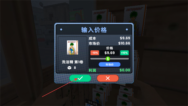 4、将取到的漫画放入货架并输入价格,查看洗洁净第1卷的成本价与市场价,确认定价后点击对应按钮完成价格设置。