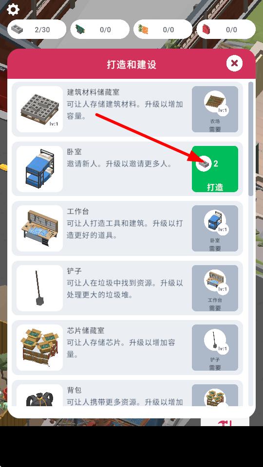 2、点击修建卧室选项,可进入建造流程,卧室建成后可邀请新人加入,拓展游戏内的人口的资源。