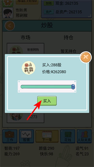 2、在股票界面选择合适的股票如爸爸网购,调整持股数量后点击买入,借助投资获取资产收益,注意结合自身现金状况选择投资规模,避免资金过度消耗。