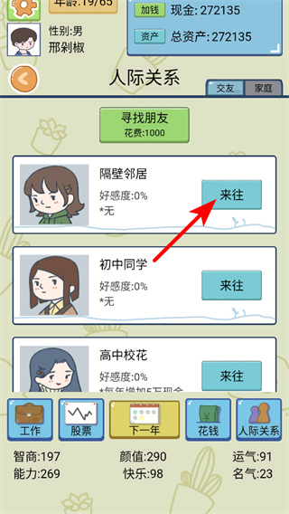 1、进入社会阶段后,点击人际关系按钮进入社交界面,选择已有联系人如隔壁邻居点击来往,消耗少量现金提升好感度,积累人际关系资源以解锁后续互动。