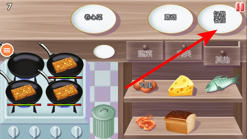 4、根据上方的菜品需求如奶酪番茄,从食材区选择对应食材,完成烹饪准备。