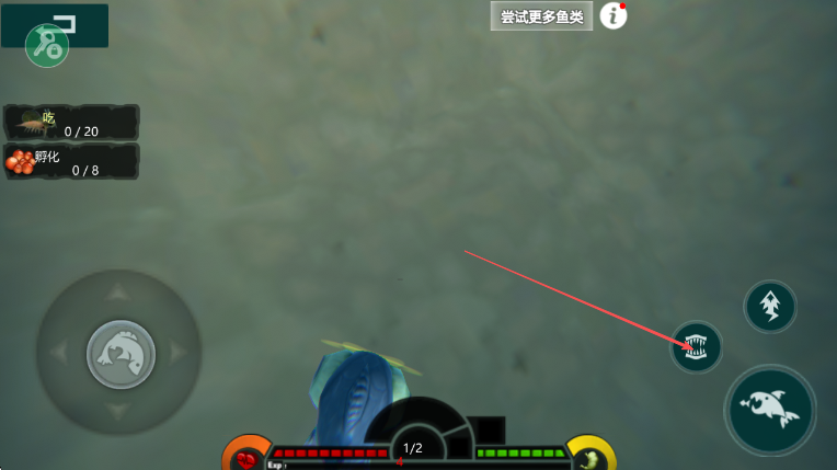 1、进入游戏,通过左侧虚拟摇杆箭头所指操控蓝色鱼类移动。